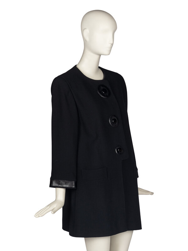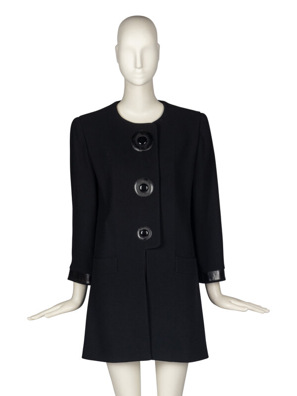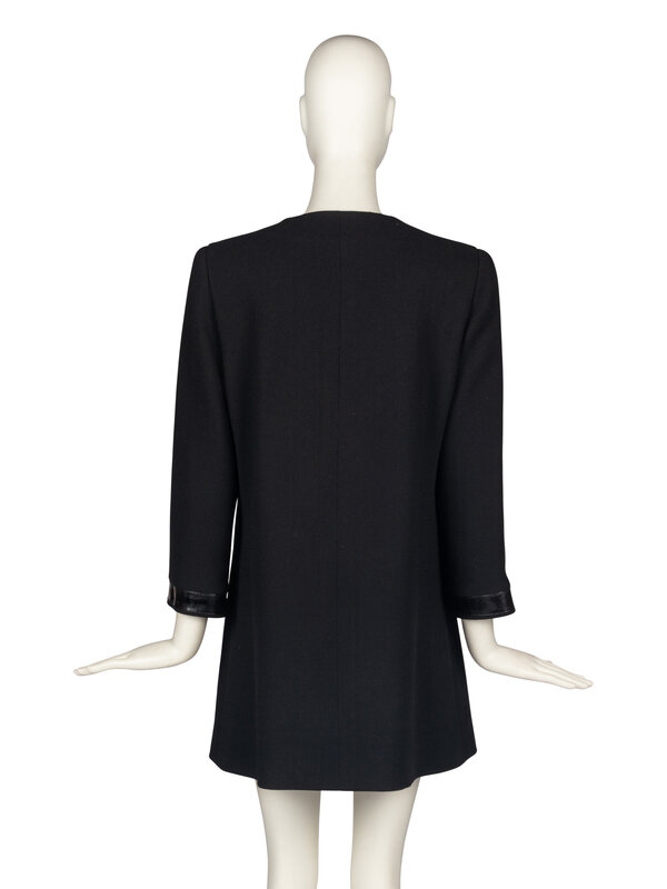 Long collarless jacket in black crepe. Vinyl accents. Two front pockets. Lined. Snap closures.