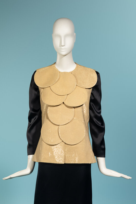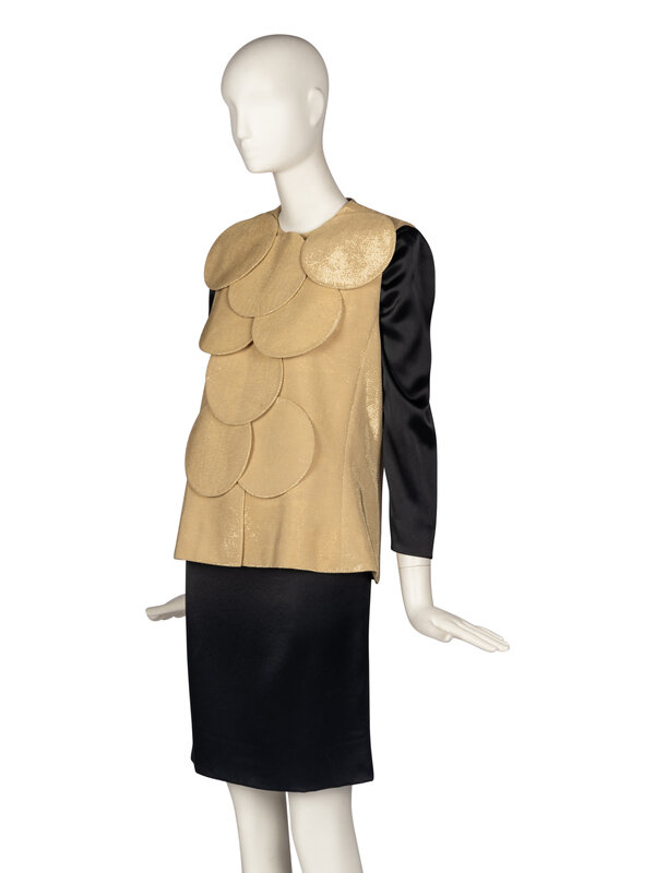 Gold lamé vest with large circular attachments. Snap closures. Fully lined.