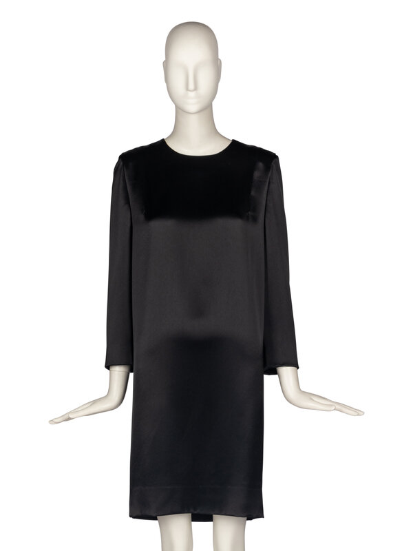 Long-sleeve shift dress in black satin. Shoulder pads. Partially lined. Back zip closure.
