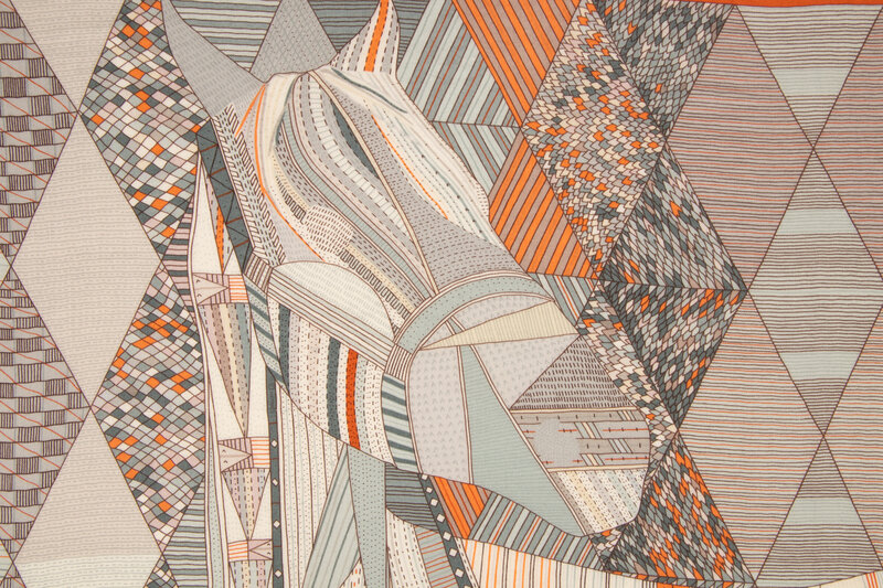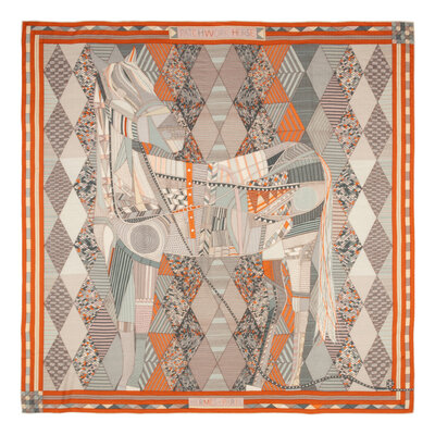 "Patchwork Horse" Scarf 140 in printed cashmere-silk. Features rolled and hand-stitched edges.
