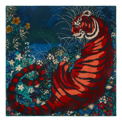 "Tyger tyger" Scarf 90 in printed silk twill. Features rolled and hand-stitched edges.