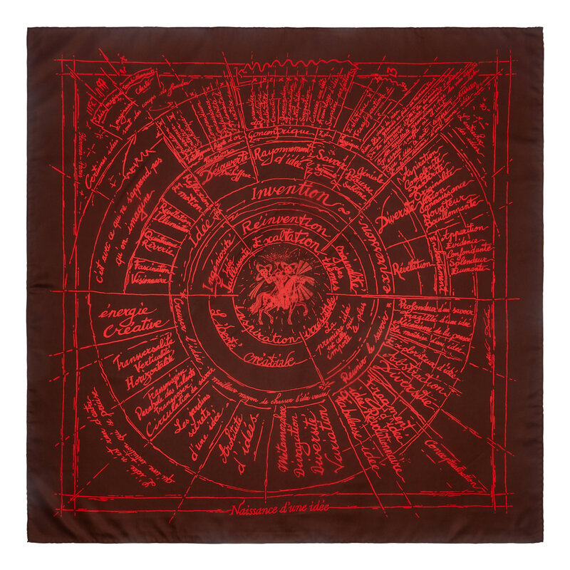 "Naissance d'une idée" Scarf 90 in printed silk twill. Features rolled and hand-stitched edges.