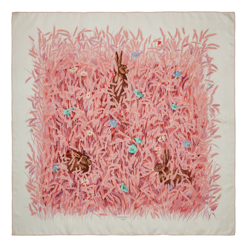 "Les Blés" Scarf 90 in printed silk twill. Features rolled and hand-stitched edges.