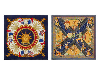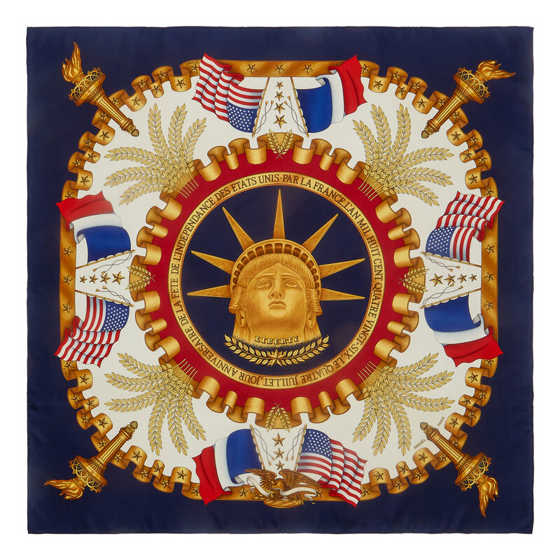 "Liberty" Scarf 90 in printed silk twill. Features rolled and hand-stitched edges.