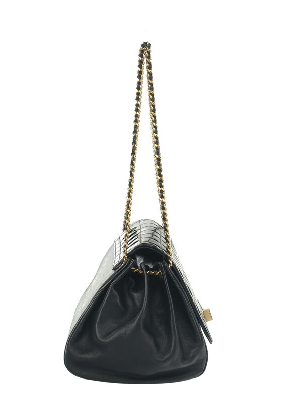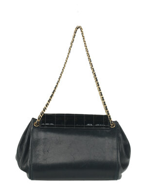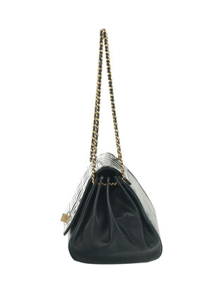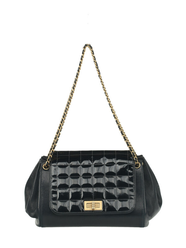 Chanel Chocolate Bar Accordion Bag in Quilted Black Patent Leather and Lambskin Leather With Brushed Gold-Tone Metal Hardware. Mademoiselle Turn-Lock Closure and Interwoven Leather Chain.