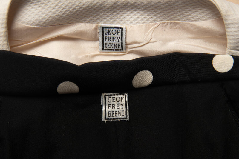 Raglan-sleeve, polka-dot dress with notch lapel. Small gaps in shoulder seams, creating a cutout effect. Concealed side zip closure. Lined.