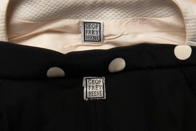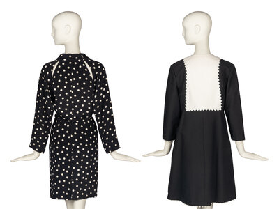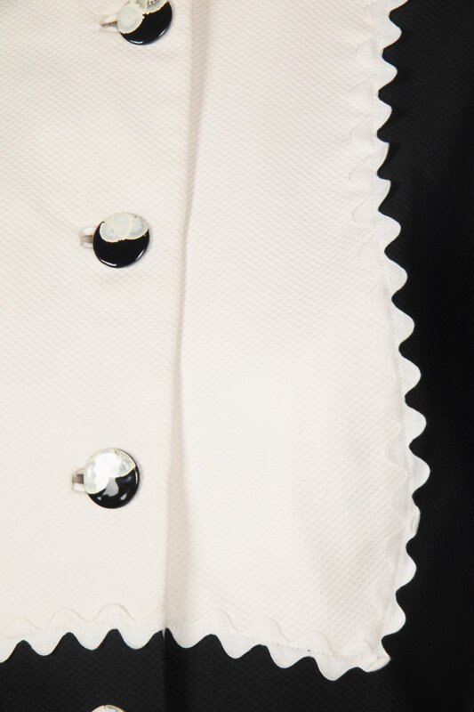 Mid-length dress in black with contrasting white bib panel. Front button closure. Two pockets in side seams.