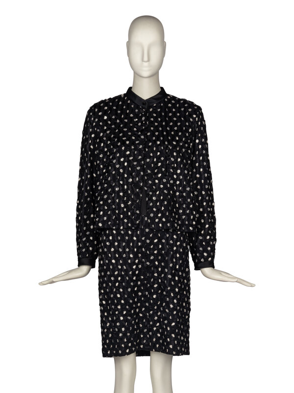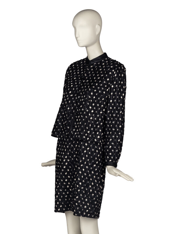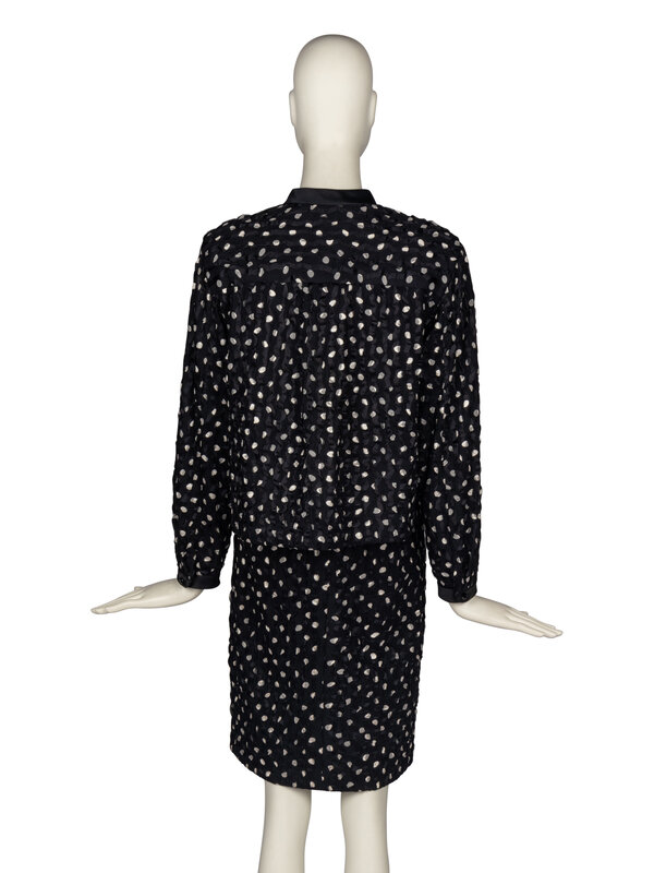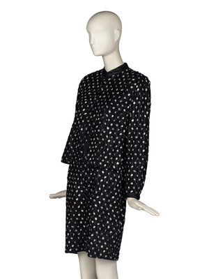 Band-collar black silk jacket in wave-textured crepe and satin with polka dots. Buttons approximately to chest and open-front below. Pocket at chest. Lined.