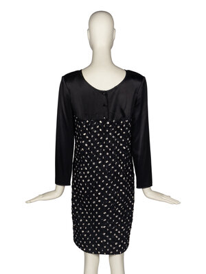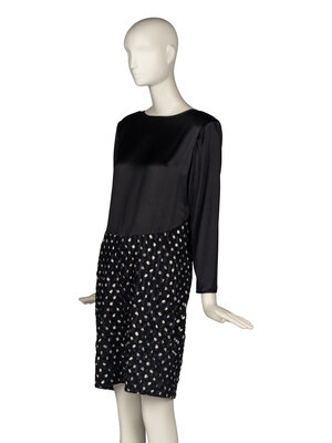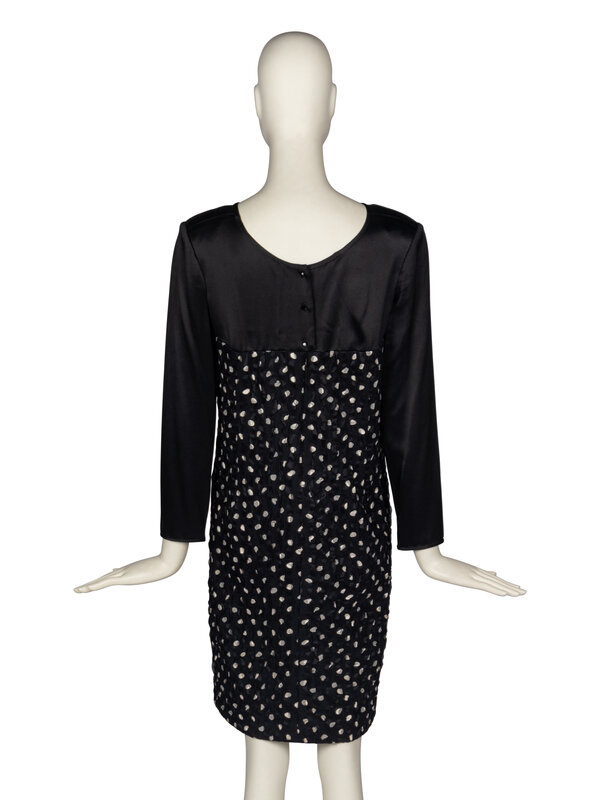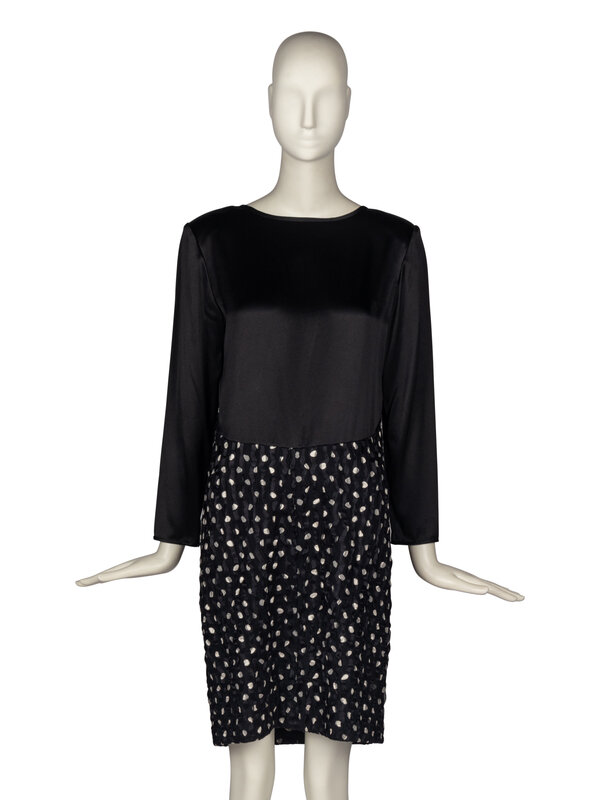 Black long-sleeve shift dress with asymmetrical satin bodice and polka-dot textured crepe and silk skirt. Shoulder pads. Rear button and zip closures.