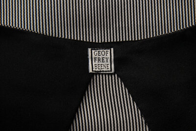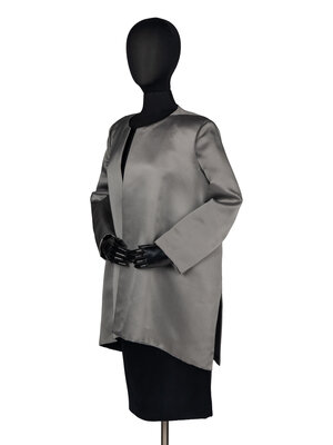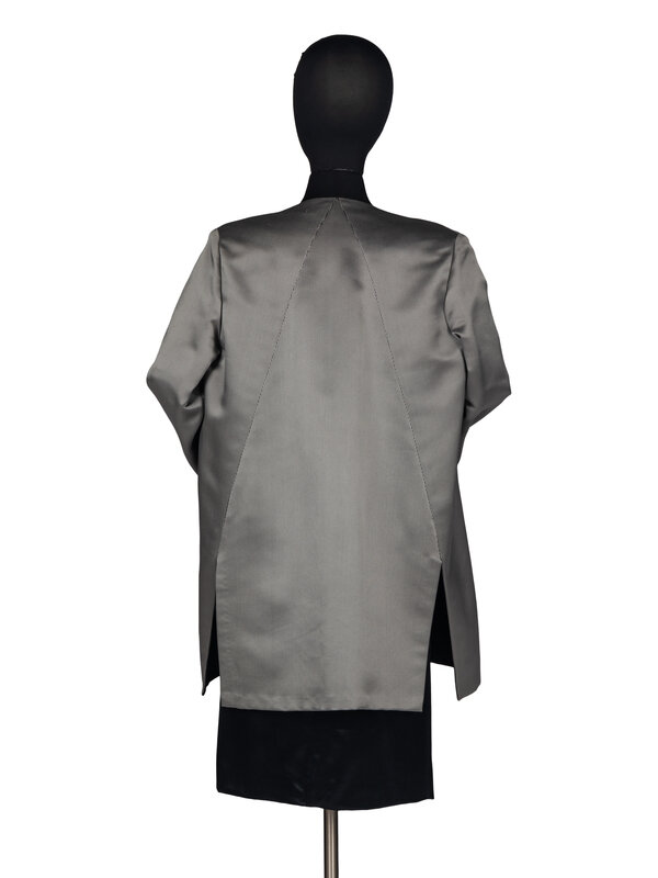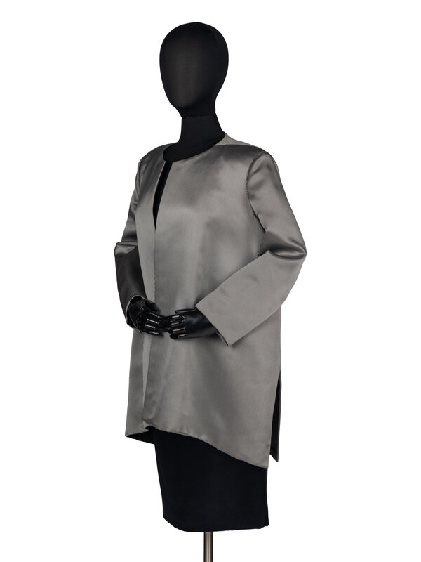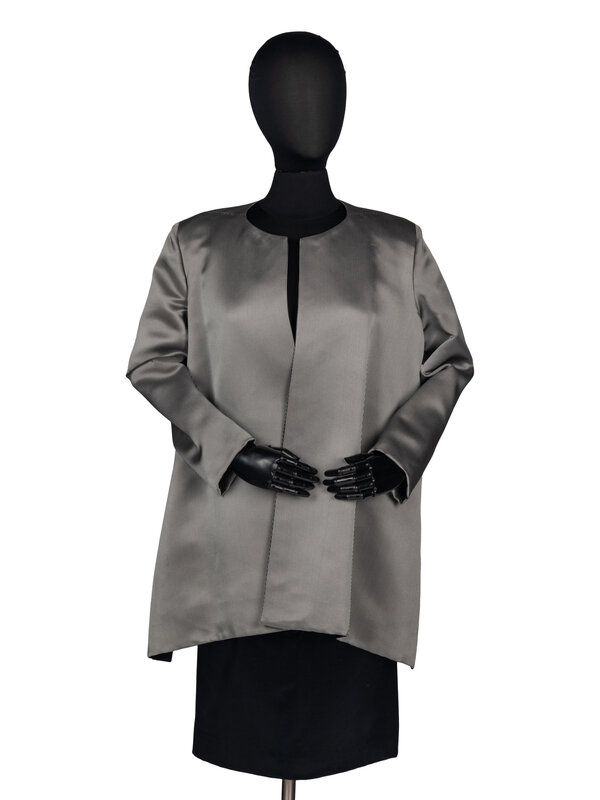Collarless, open-front pinstripe jacket in double-faced silk satin. Side vents. Shoulder pads.