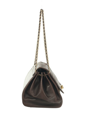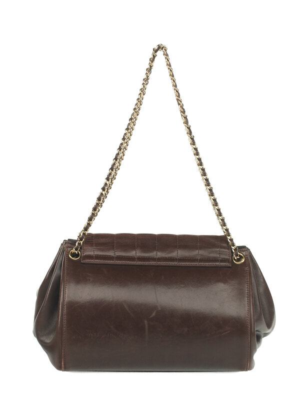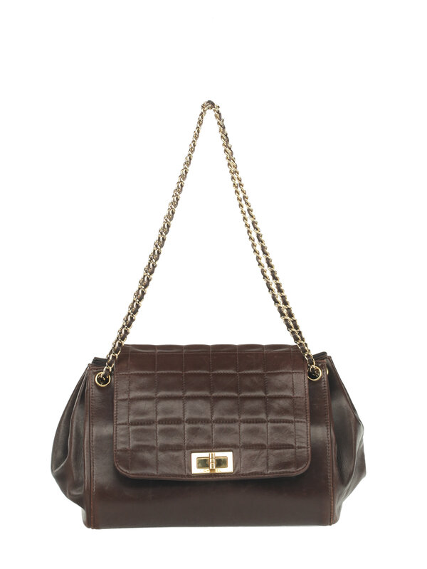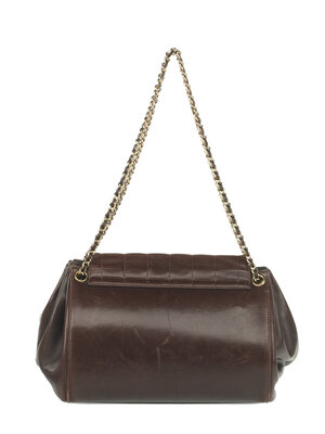 Chanel Chocolate Bar Accordion Bag in Quilted Brown Lambskin Leather with 24K Gold-Plated Hardware. Mademoiselle Turn-Lock Closure and Interwoven Leather Chain.
