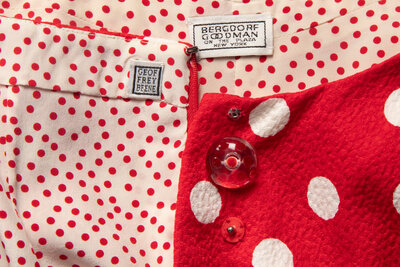 Red and white polka dot jacket. Three large polka dot buttons and concealed snap closures. Lined.