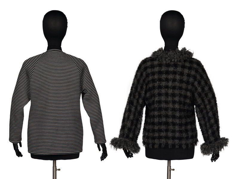 Cropped pullover sweater in grey and black-checkered bouclé. Curly trim at neckline and cuffs. Features a hook-and-eye at neckline which may be worn closed for a keyhole effect, or open as a scoop neck.