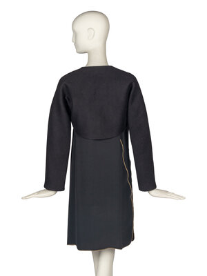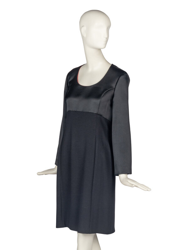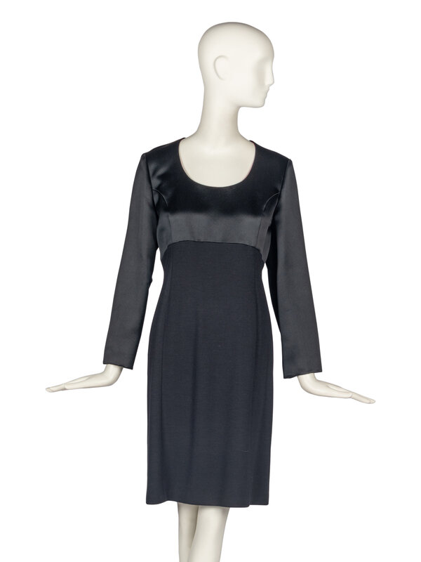 Mid-length black, long-sleeve dress in heavy silk and wool jersey. Lined. Rear zip closure.