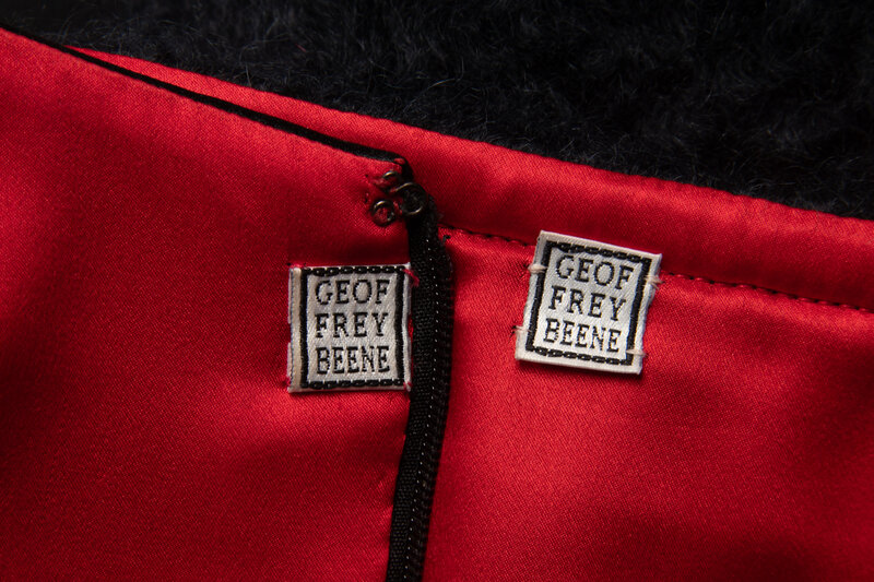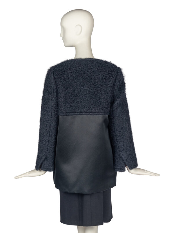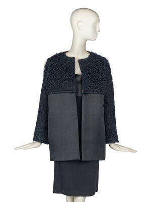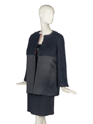 Collarless, open-front jacket in black tufted wool and heavy silk. Two pockets in side seams. Partially lined with red charmeuse. Small vents at cuffs,