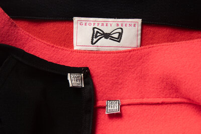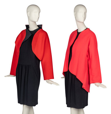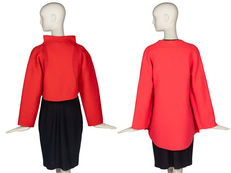 Collarless, open-front jacket in pinkish-red wool blend. Continuous, exaggerated French seams from side body through the sleeves. Asymmetrical hem. Unlined.