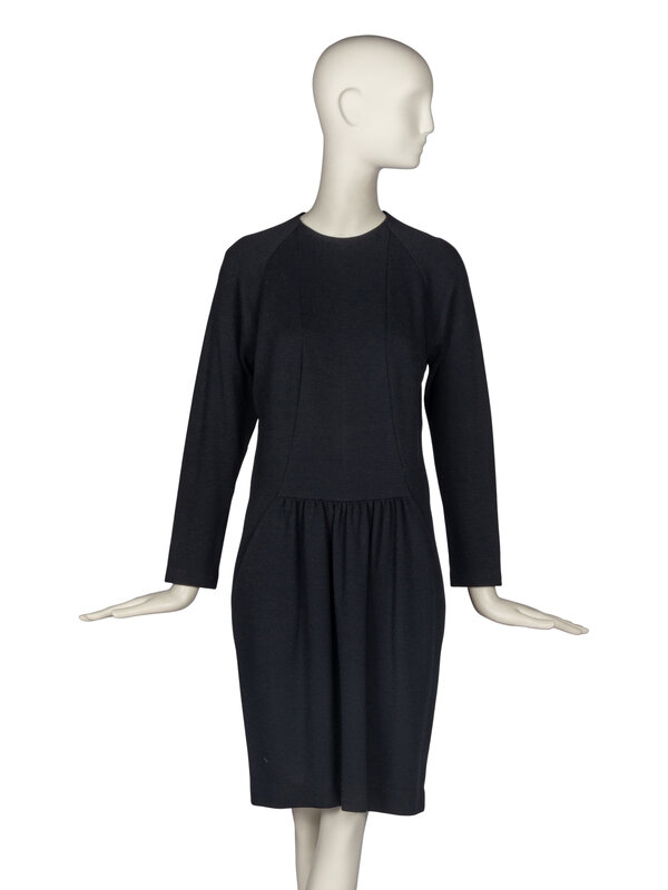 Raglan-sleeve dress in black crepe. Gathered front waist. Two inseam pockets. Unlined. Rear zip closure.