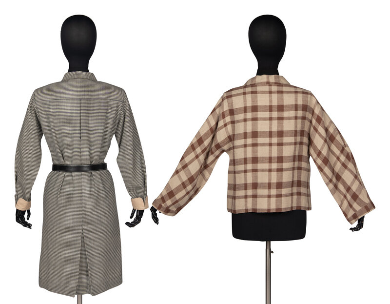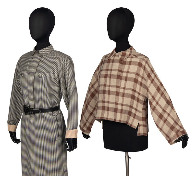 Popover blouse in brown and beige linen plaid. Kimono-style sleeve. Single-button flap closure, concealed beneath collar. Small side vents.