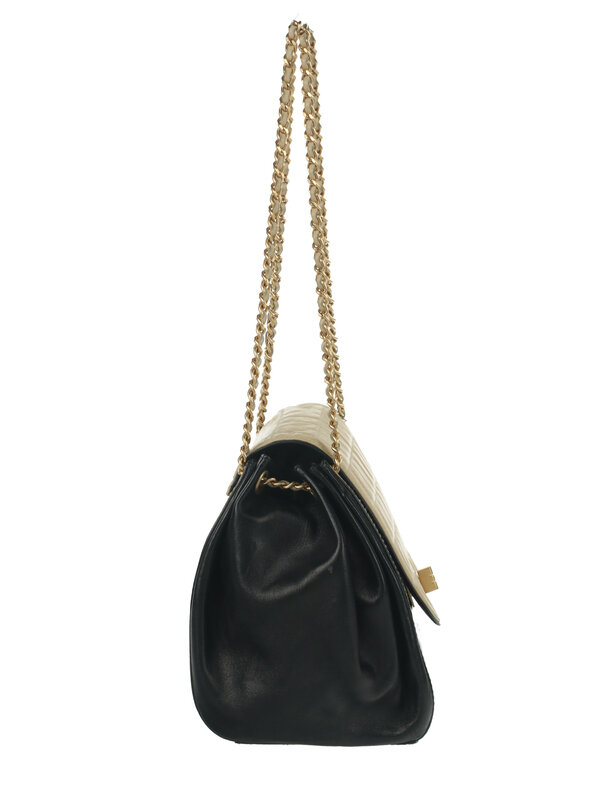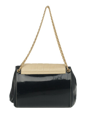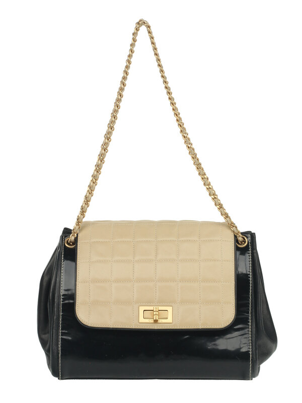 Chanel Medium Chocolate Bar Accordion Bag in Quilted Beige Lambskin and Black Patent and Lambskin Leather with Gold-Tone Hardware. Mademoiselle Turn Lock Closure and Thin Interwoven Leather-Metal Strap.