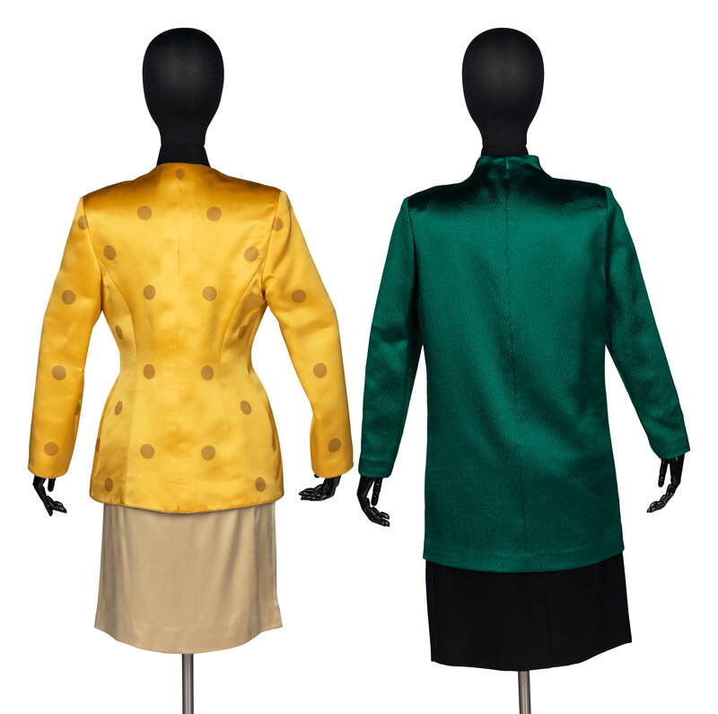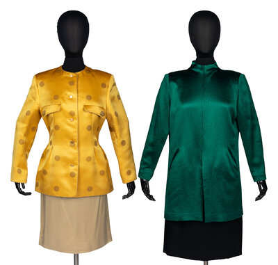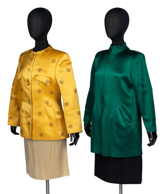 Collarless waisted jacket in yellow silk satin with polka dots. Shoulder pads. Decorative chest pockets. Gold-tone metal buttons and gold lamé trim. Lined