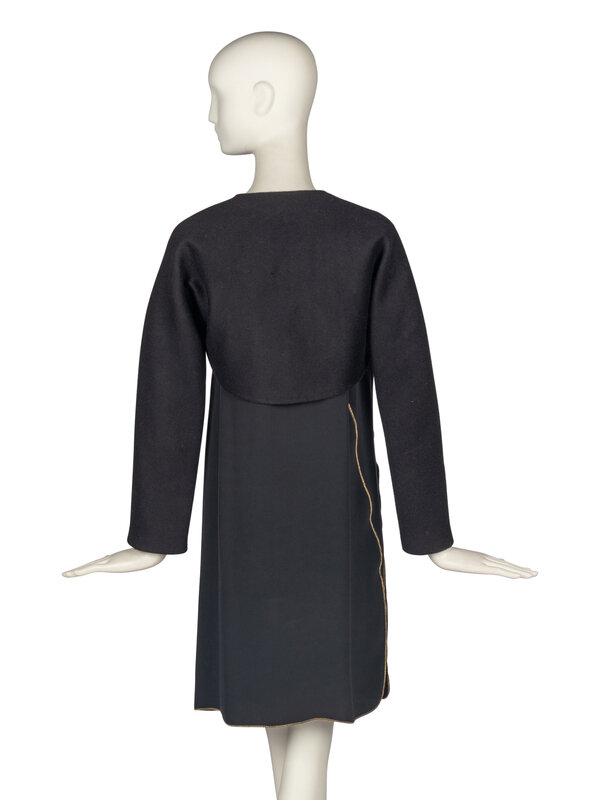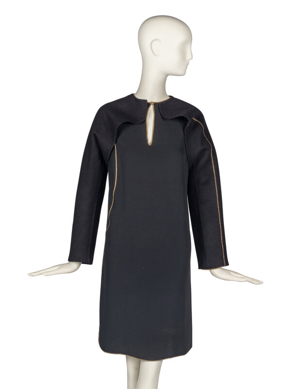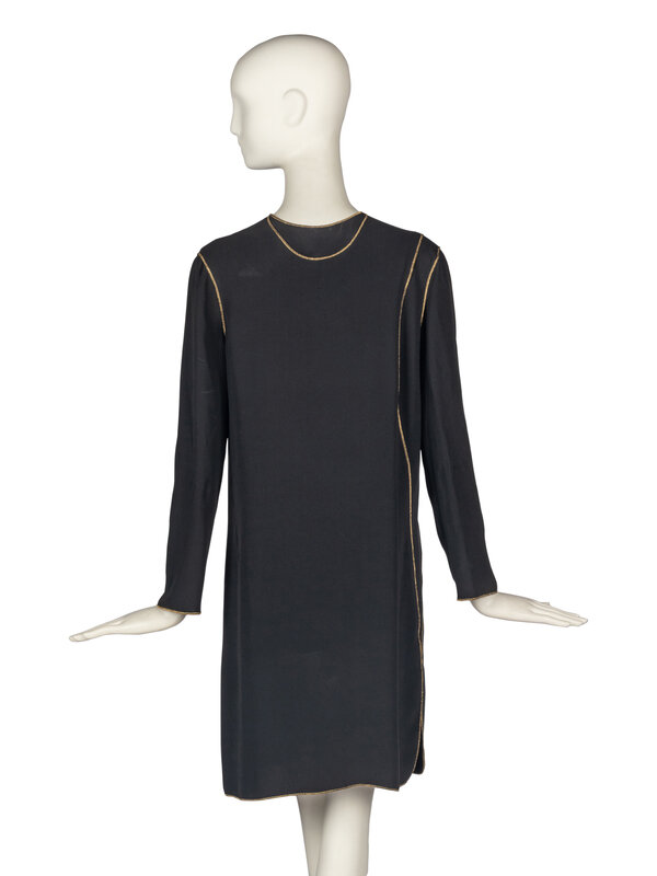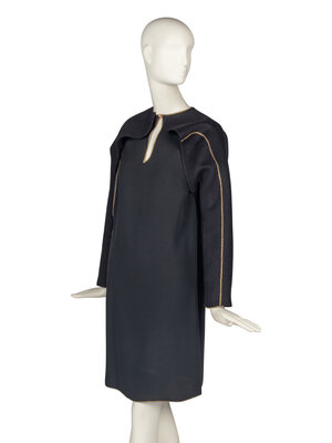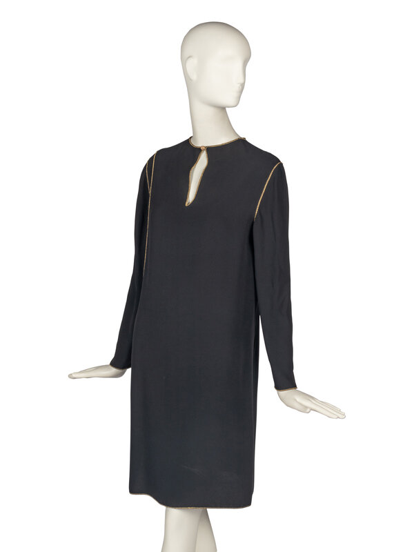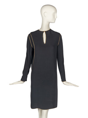 Straight, long-sleeve black dress with gold trim. Asymmetrical application of trim along left side leads to a small vent. Unlined. Single-button closure at rear neckline.