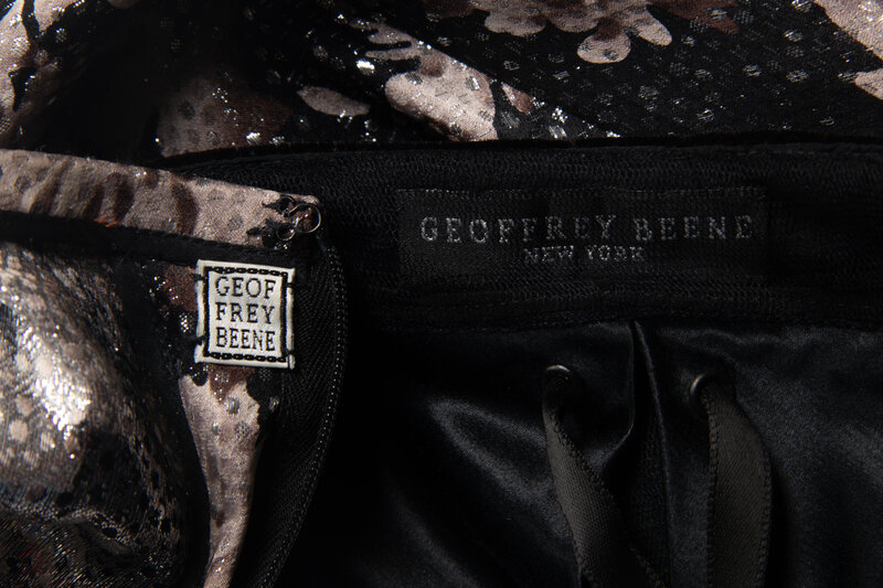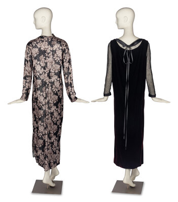 Mesh-sleeve gown in black velvet with burgundy undertones. Large front center vent. Boat neckline, straight silhouette. Pullover, with tie at rear neckline. Lined.