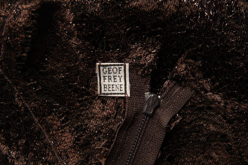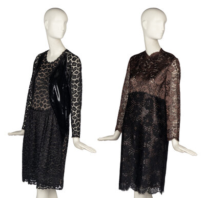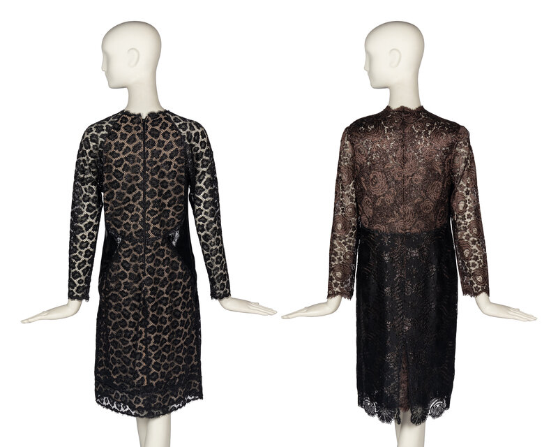 Long-sleeve straight dress floral-motif metallic brown lace. Black lace comprises an additional layer around the skirt, plus inserts in bodice sides. Sheer due to lack of lining. Rear zip closure.