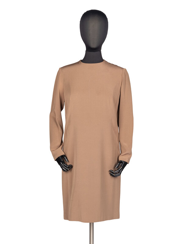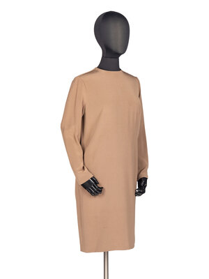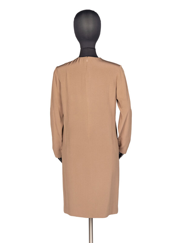 Long-sleeve shift dress. Slight gathering at shoulder. Lined. Rear zip closure.