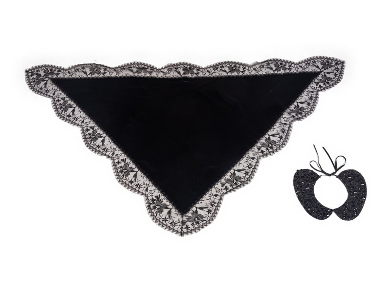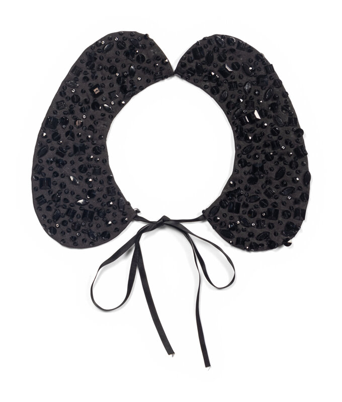 Rounded false collar in black with beaded embellishments. Tie closure.