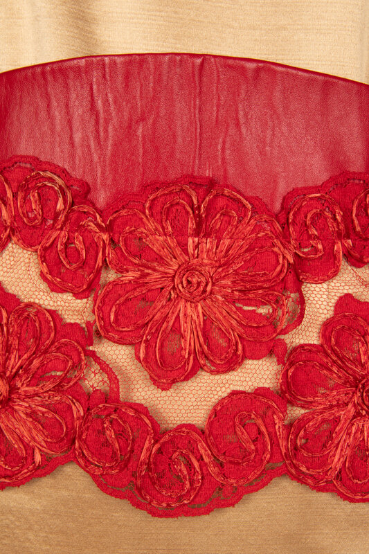 Long straight skirt in light gold silk. Rear vent. Rear zip closure.