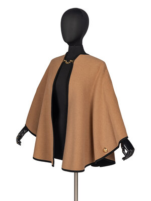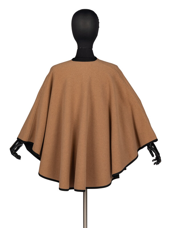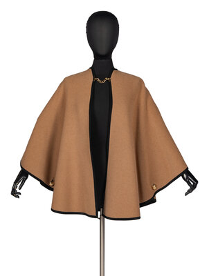 Tan wool-cashmere cape. Black grosgrain trim. Black interior. Gold-tone metal hook-and-chain closure at neck. A gold-tone metal button at either side which may be done to create a quasi-armhole.