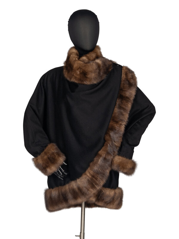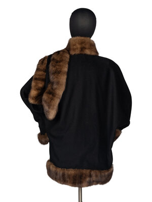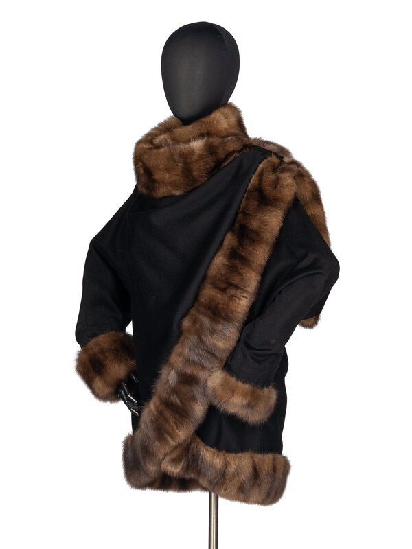 Dolman-sleeve, wrap-front coat in black felted wool with Barguzinsky Russian sable fur trim. Two welt pockets, silk jacquard lining, single-button closure.