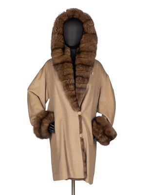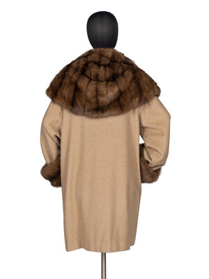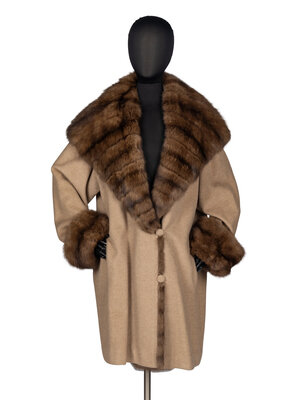 Stroller-length coat in khaki wool with Barguzinsky Russian sable fur trim. Exaggerated shawl collar, rolled cuffs, two-button front closure, two slash pockets, silk lining.