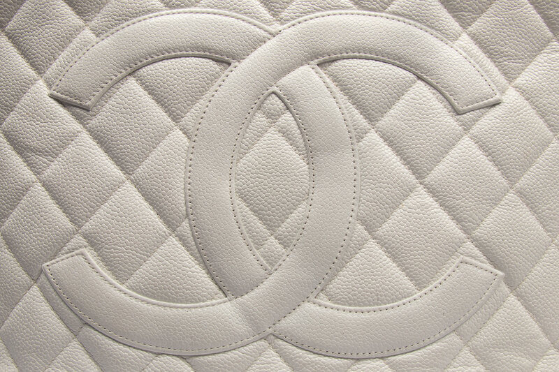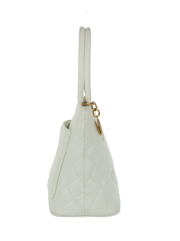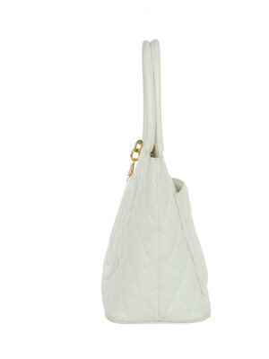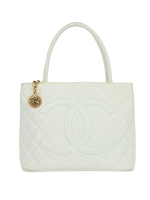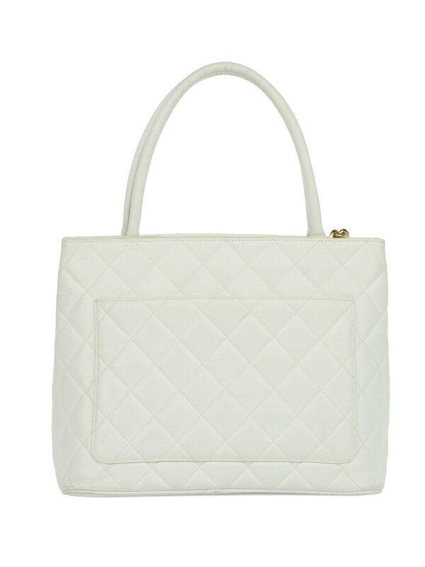 Chanel Medallion Tote Bag in Quilted White Caviar Leather with Gold-Tone Hardware. Zipper Closure and Top Handles.