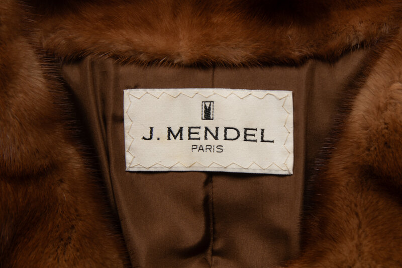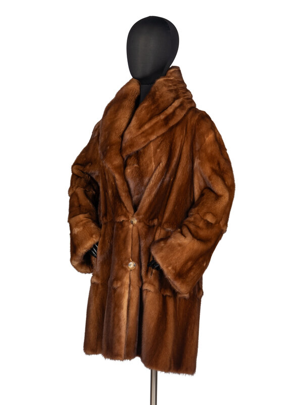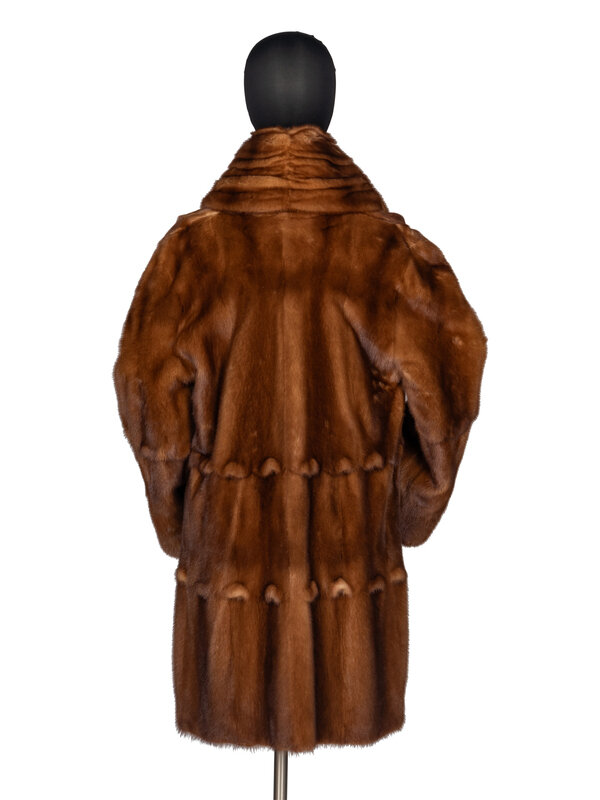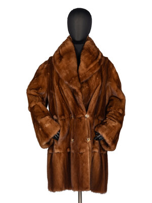 Stroller-length coat in whiskey-colored, wild-type mink. Double-breasted, shawl collar, two inseam pockets, lined.