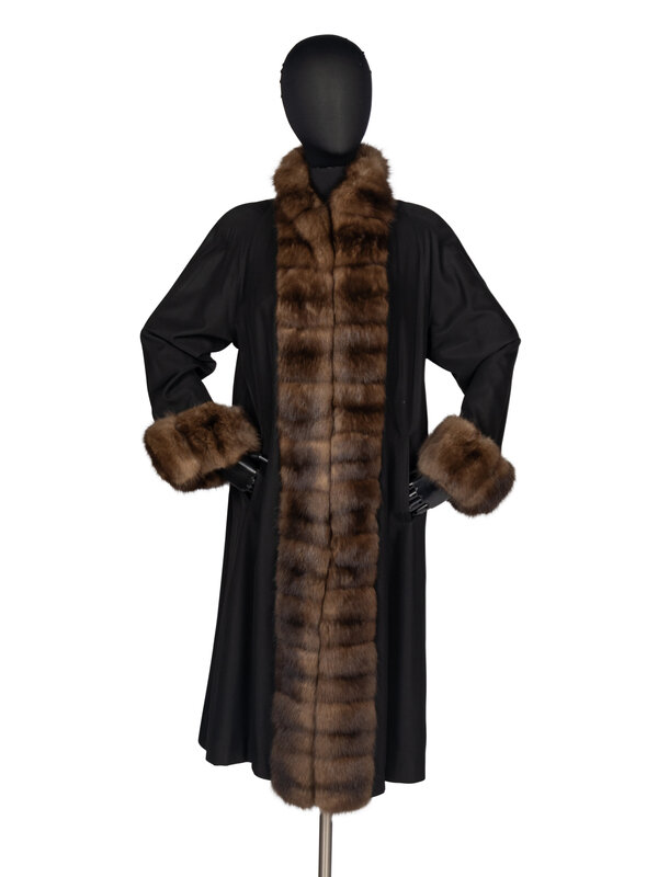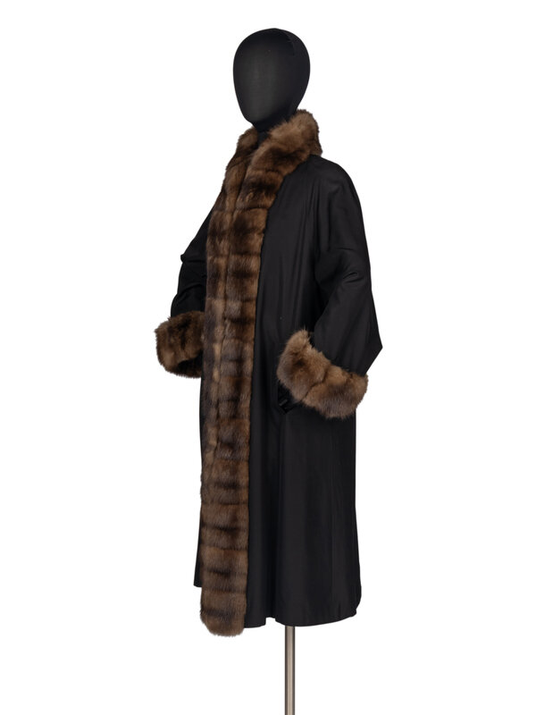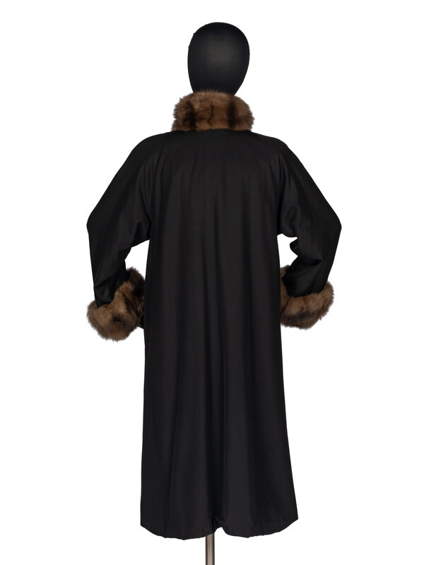 Black dolman-sleeve coat with Barguzinsky Russian sable fur cuffs and sheared, dark brown mink lining. Two pockets. Hook-and-eye closures.