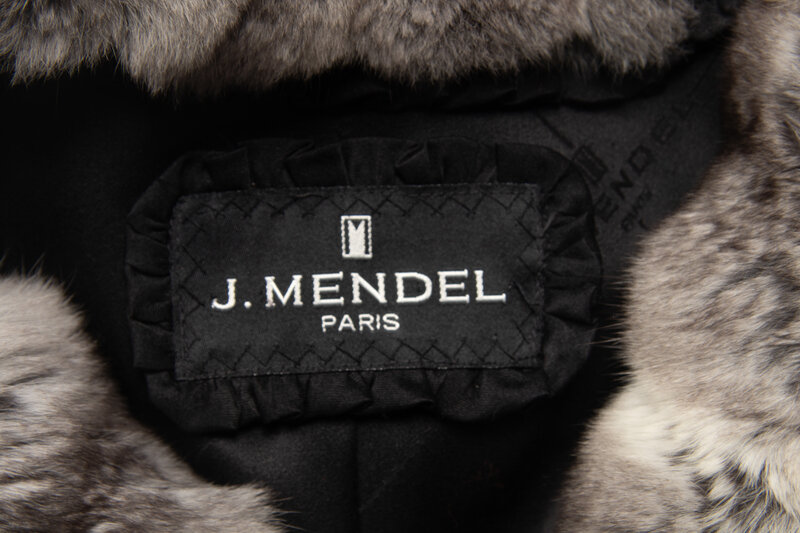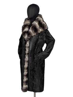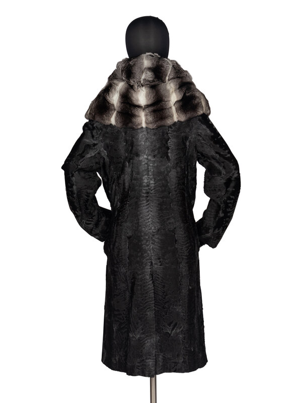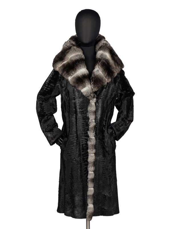 Black broadtail lamb-fur coat with chinchilla trim. Exaggerated shawl collar, two slash pockets, hook-and-eye closure, silk jacquard lining.