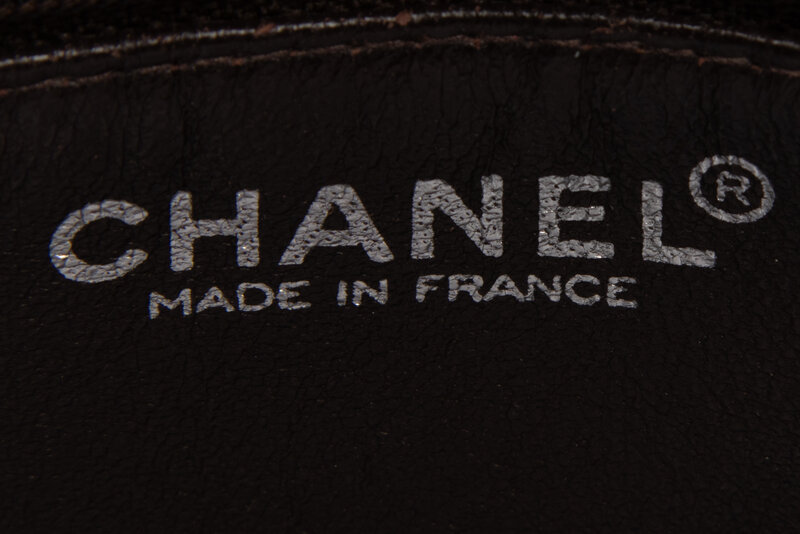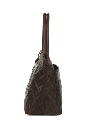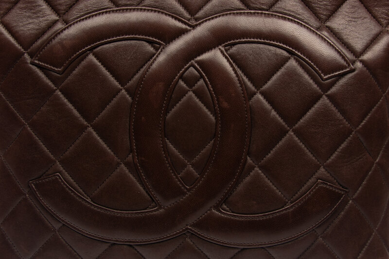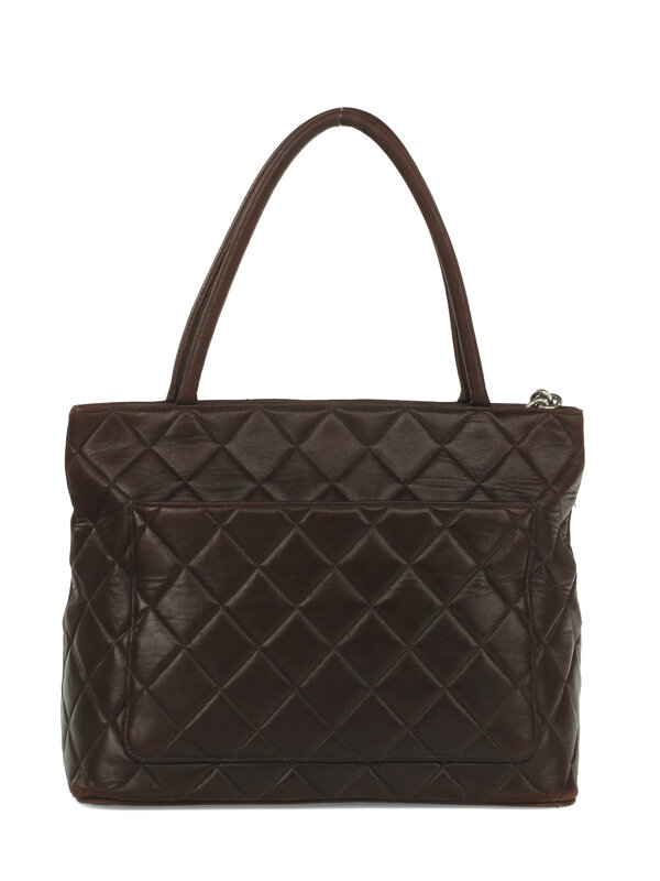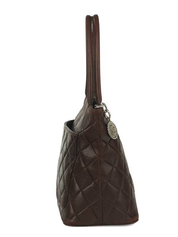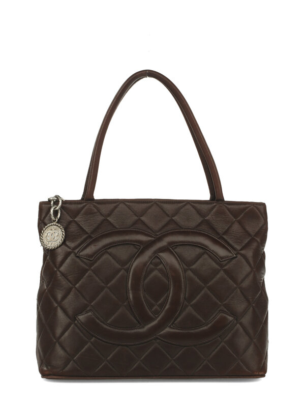 Chanel Medallion Tote Bag in Quilted Brown Lambskin with Silver-Tone Hardware. Zipper Closure and Top Handles.