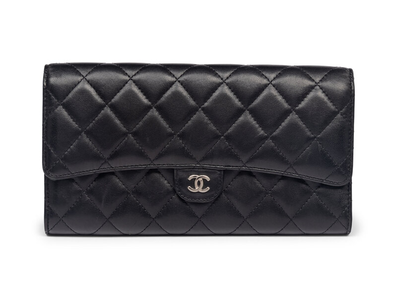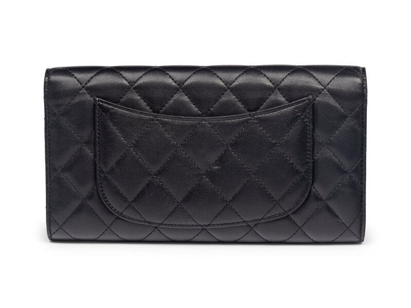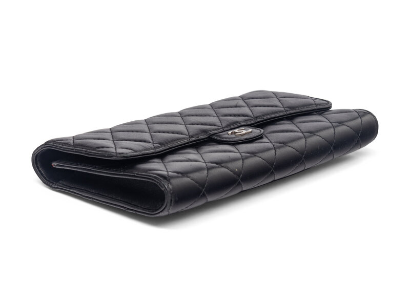 Chanel Classic Flap Wallet Clutch in Quilted Black Lambskin). Snap Closure.