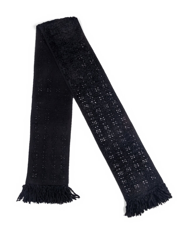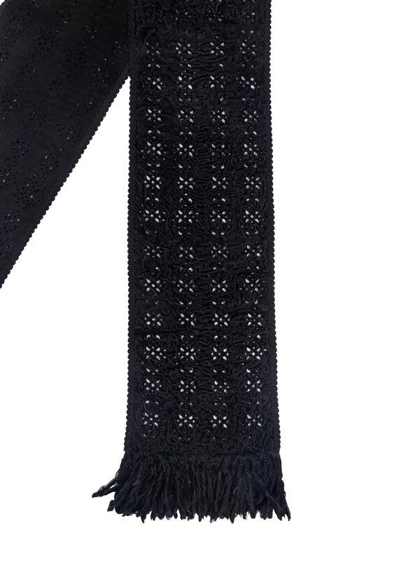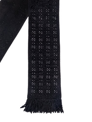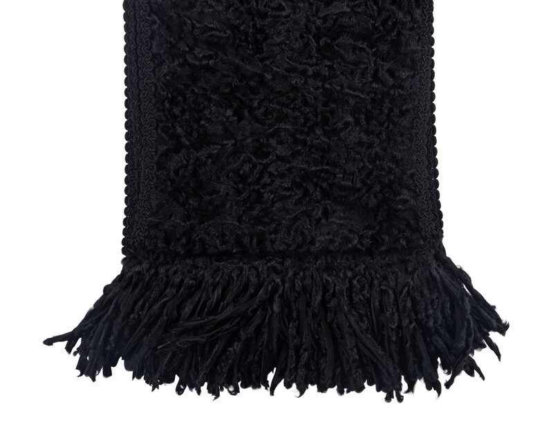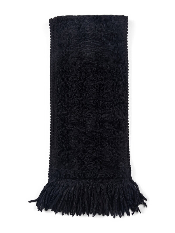 Black broadtail lamb fur scarf with laser-cut eyelets. The pelt itself is fringed on the scarf's short sides, with braided textile trim on the long sides. Reverse is suede.