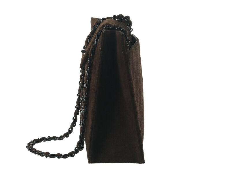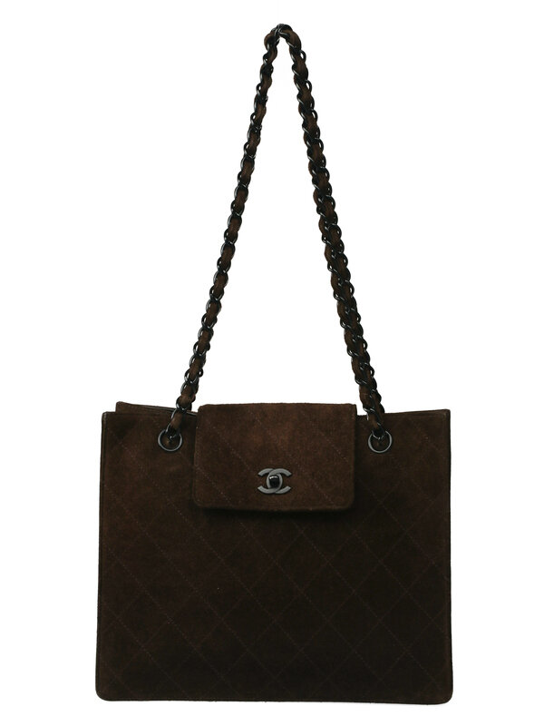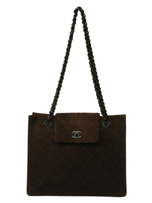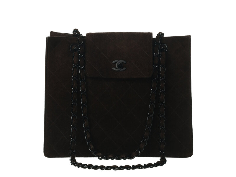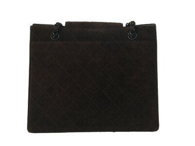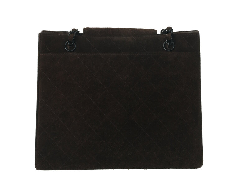 Chanel Square Flap Tote Bag in Quilted Brown Suede with Matte Black Hardware. CC-Turn Lock and Interwoven Leather Chain.