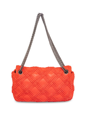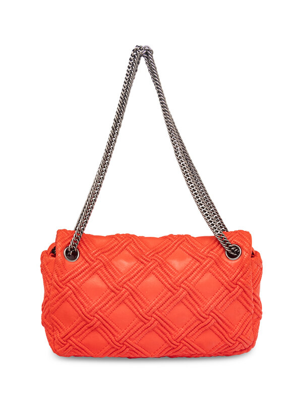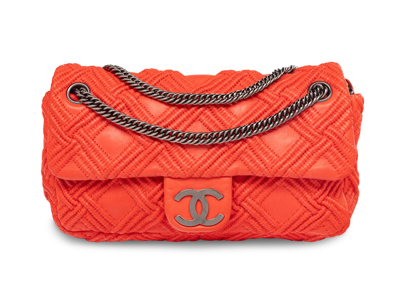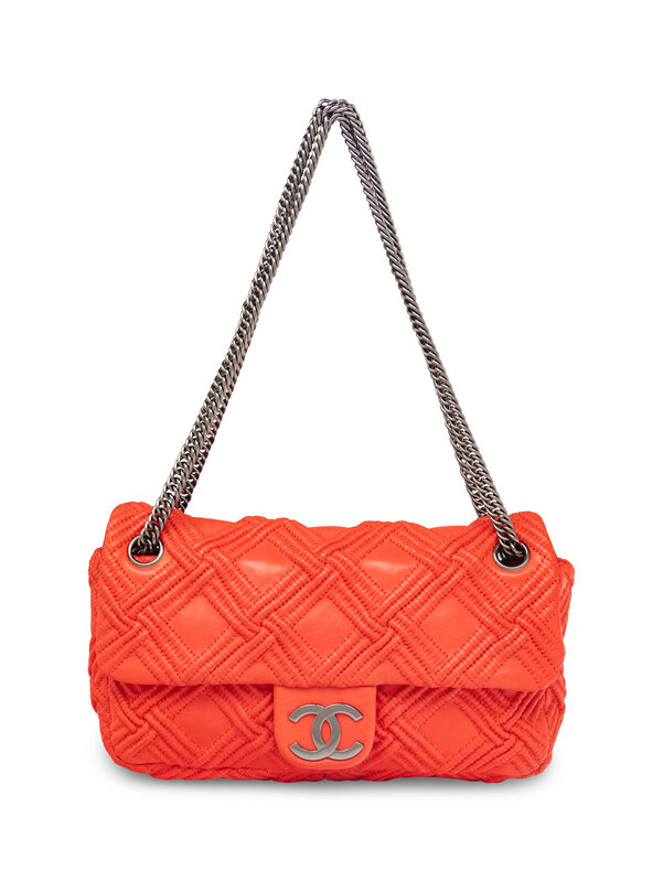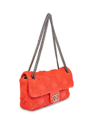 Chanel Walk of Fame Single-Flap Shoulder Bag in Diamond-Woven Coral Lambskin with Ruthenium Hardware. Magnetic Snap Closure and Bijoux Chain.