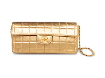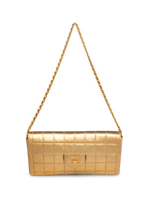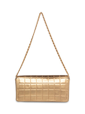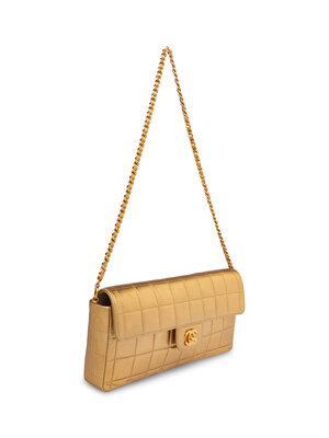 Chanel Chocolate Bar East-West Bag in Quilted Gold Lambskin with Matte Gold-Tone Hardware. CC Turn-Lock Closure and Thin Interwoven Leather-Metal Strap.