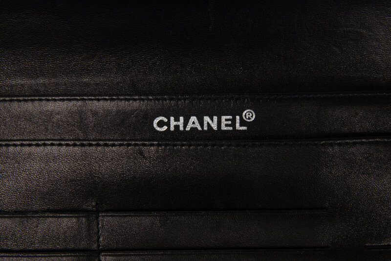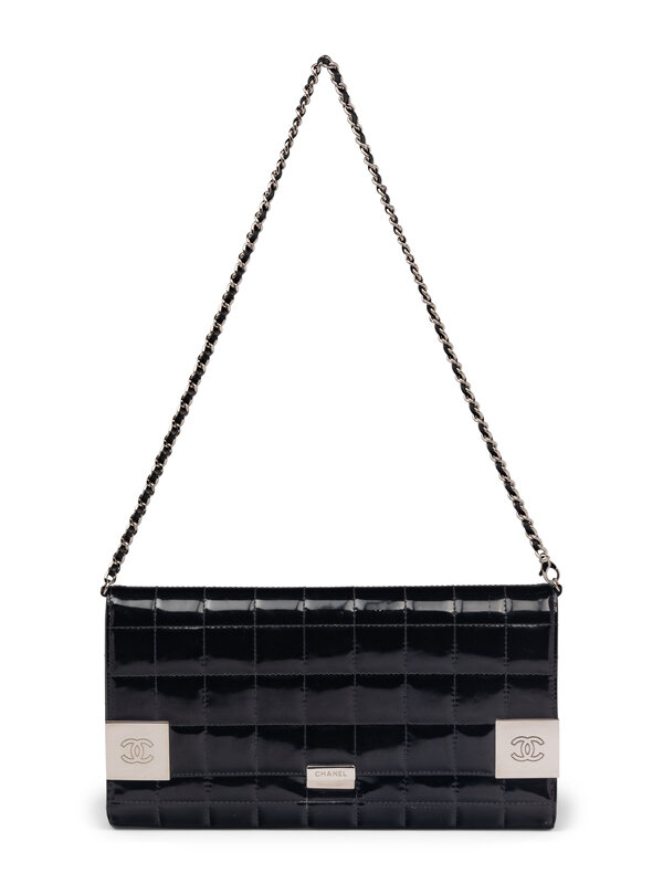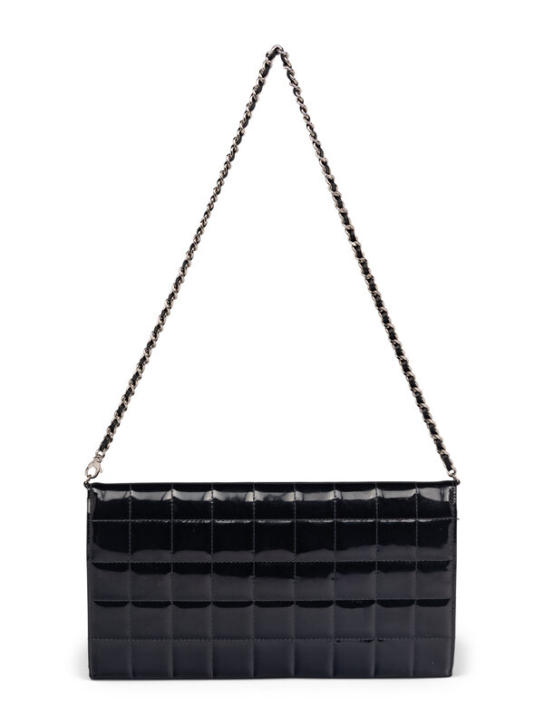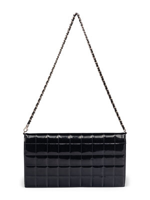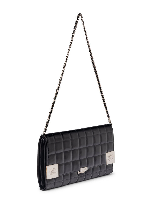 Chanel Chocolate Bar Wallet-On-Chain Bag in Quilted Black Patent Leather with Silver-Tone Metal Hardware. Magnetic Snap Closure and Thin Interwoven Leather Chain.