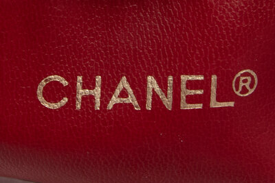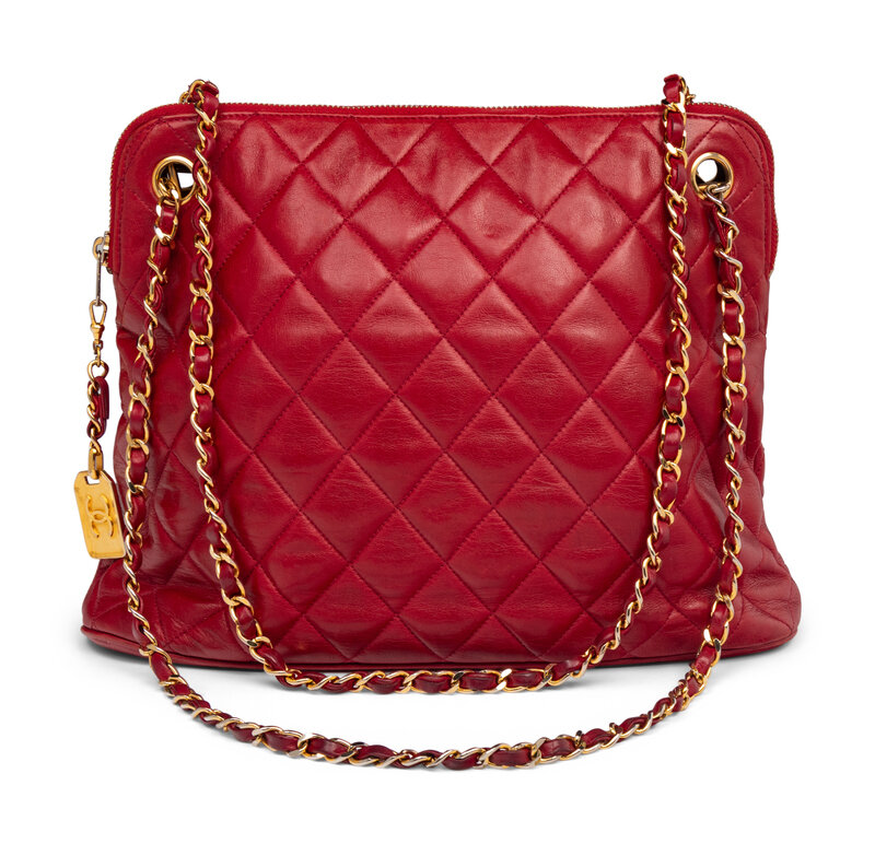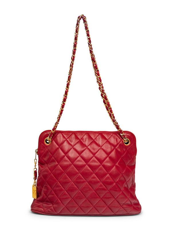 Chanel Shoulder Bag in Quilted Red Lambskin with Gold-Tone Metal Hardware. Interwoven Leather-Chain Strap. Ornamental Dog Tag-Shaped Zipper Pull Reading "Chanel / 31 Rue Cambon / Paris."