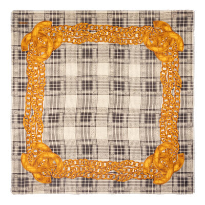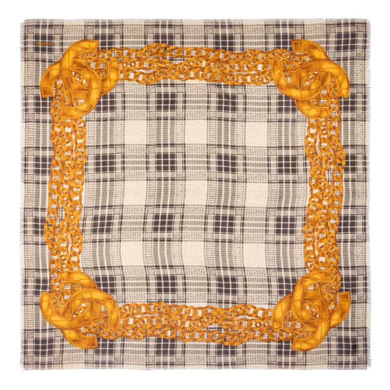 Printed silk-cashmere scarf in black-and-white plaid with gold CC and chain motifs. Unfinished edges.