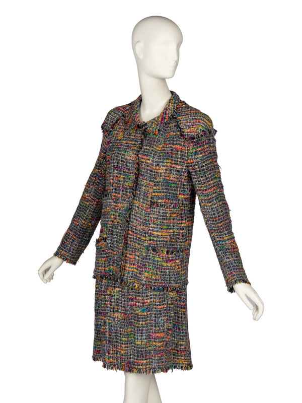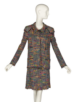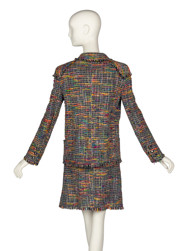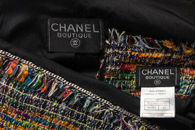Single-button jacket in multicolor tweed with shoulder pads and frayed-edge accents, silver-tone chain at the interior hem. CC jacquard lining.