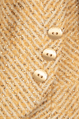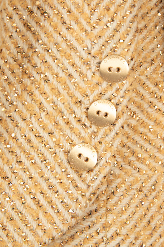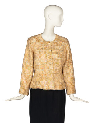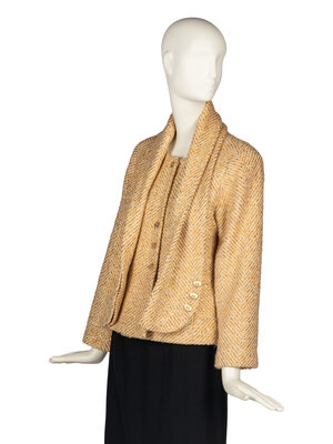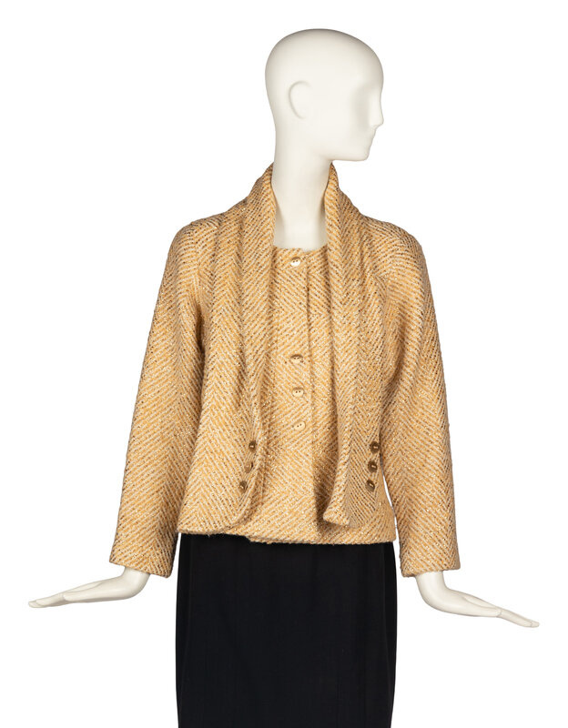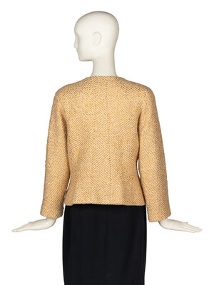 Collarless gold-metallic and white tweed jacket. Curved metal buttons. Slightly fitted. Shoulder pads. Silk lining. Matching sleeve-effect scarf.