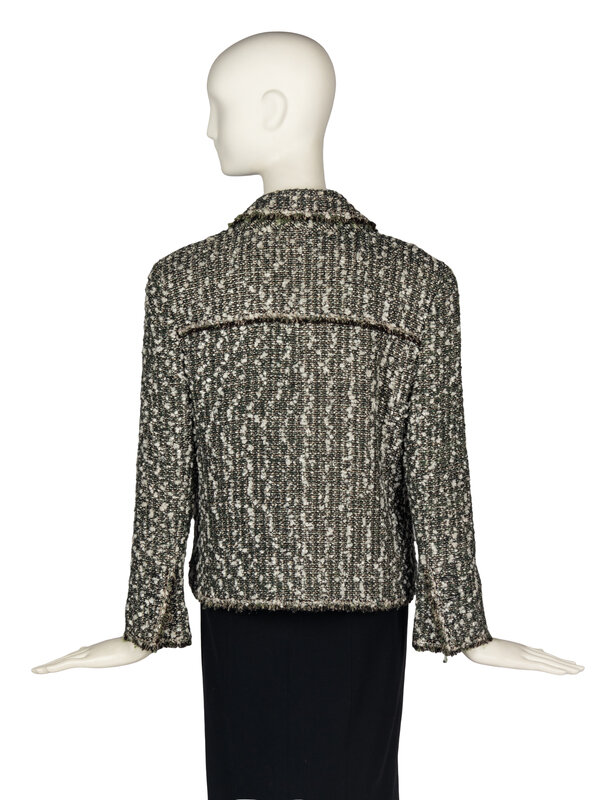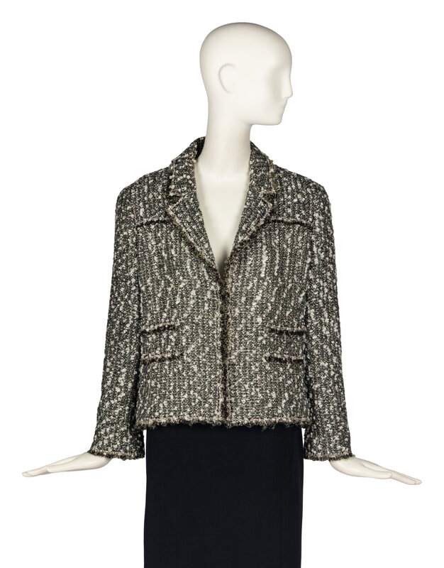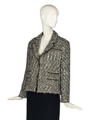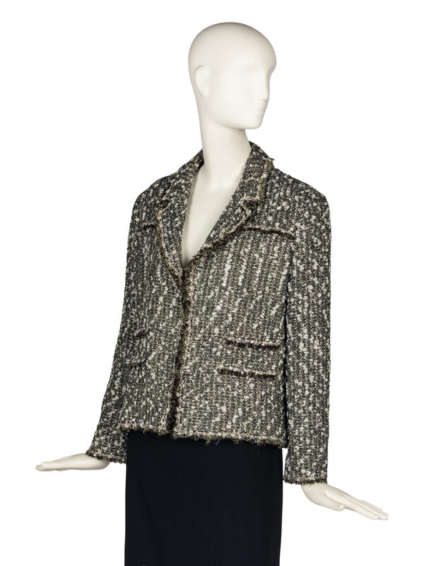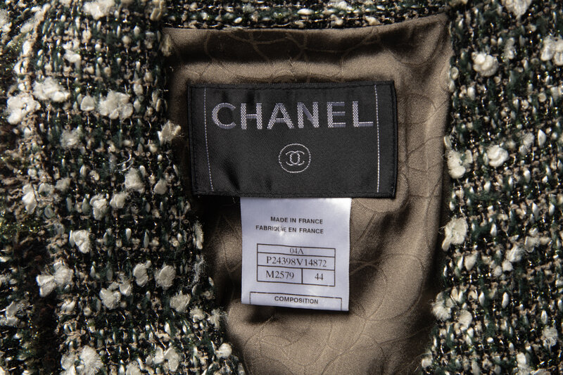 Open-front jacket in green-silver tweed with metallic threads. Surgeon's cuffs with metal buttons depicting interlocking CC logo and a bow. No pockets. Camellia jacquard lining.