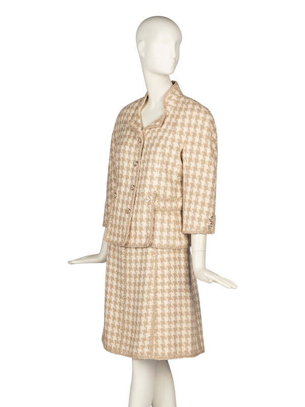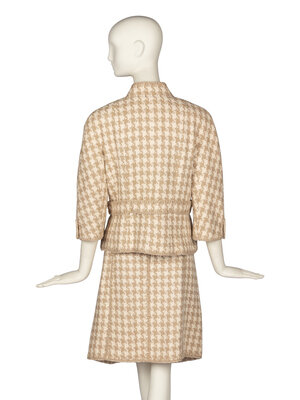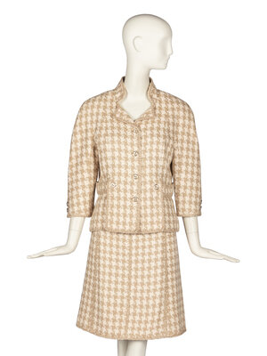 Straight skirt in beige-cream abstract houndstooth silk. Silk lining.